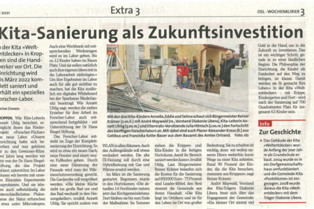 Wir freuen uns sehr, dass der Umbau der Kita Weltentdecker nun begonnen hat. Die Einrichtung wird bis März 2022 komplett saniert und erhält in Zuge dessen ein eigenes Forscher-Labor für die Kinder. Die Einrichtungsleiterin Annett Uhlig berichtet dazu, dass sie im Labor bereits mit den Kleinsten Experimente ausprobieren können und die Kinder dort auch selbstständig die unterschiedlichsten Phänomene der Natur erforschen können. Zudem wird es auch eine Werkbank mit entsprechenden Werkzeugen im Forscherraum geben. Wir sind gespannt, wie sich der Umbau in den nächsten Monaten entwickelt und wünschen der Kita Weltentdecker alles Gute und viel Erfolg!